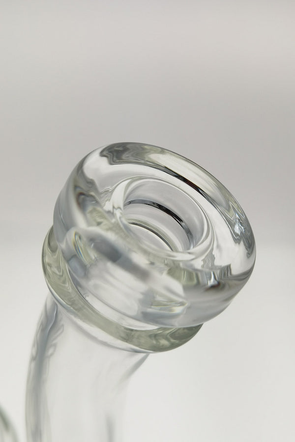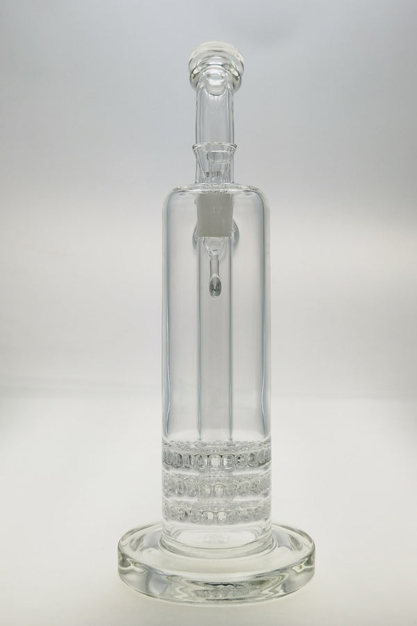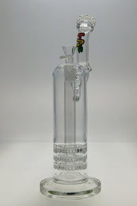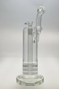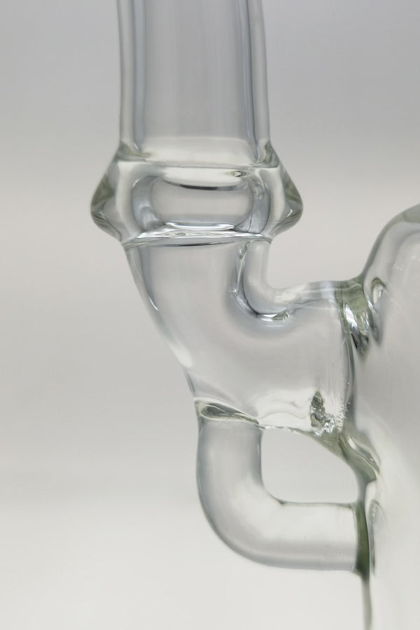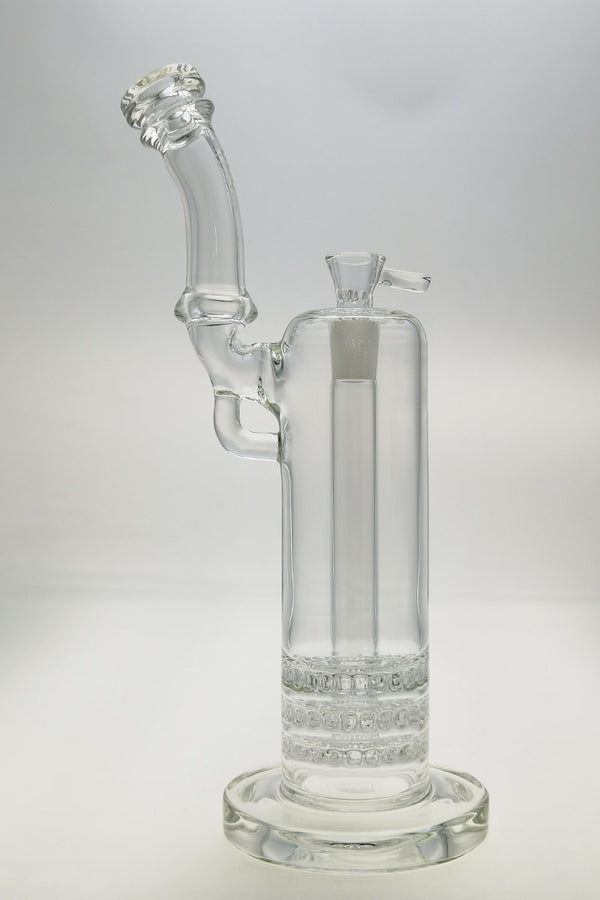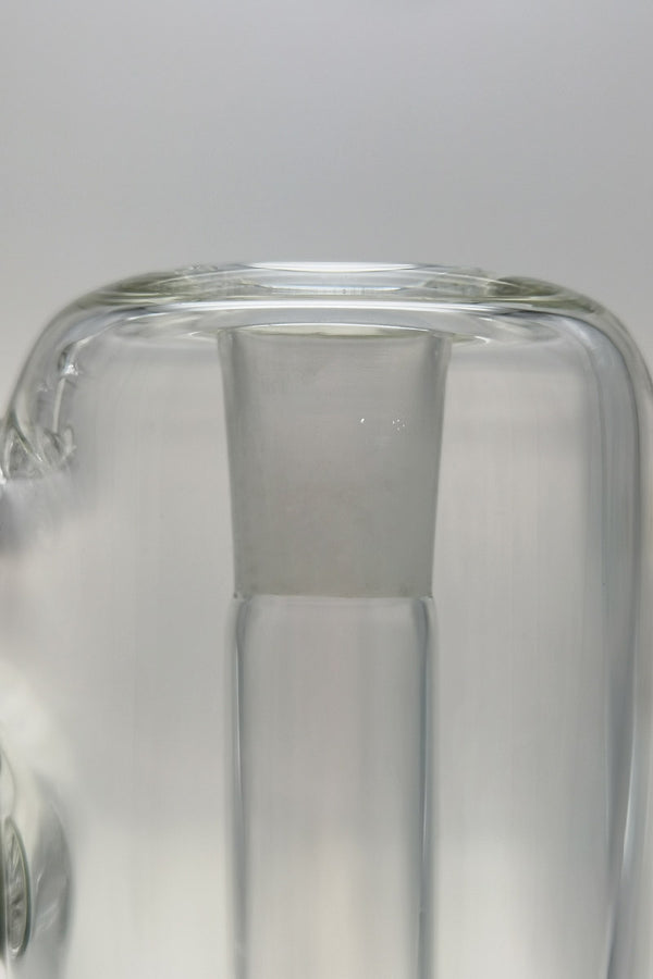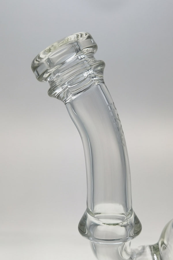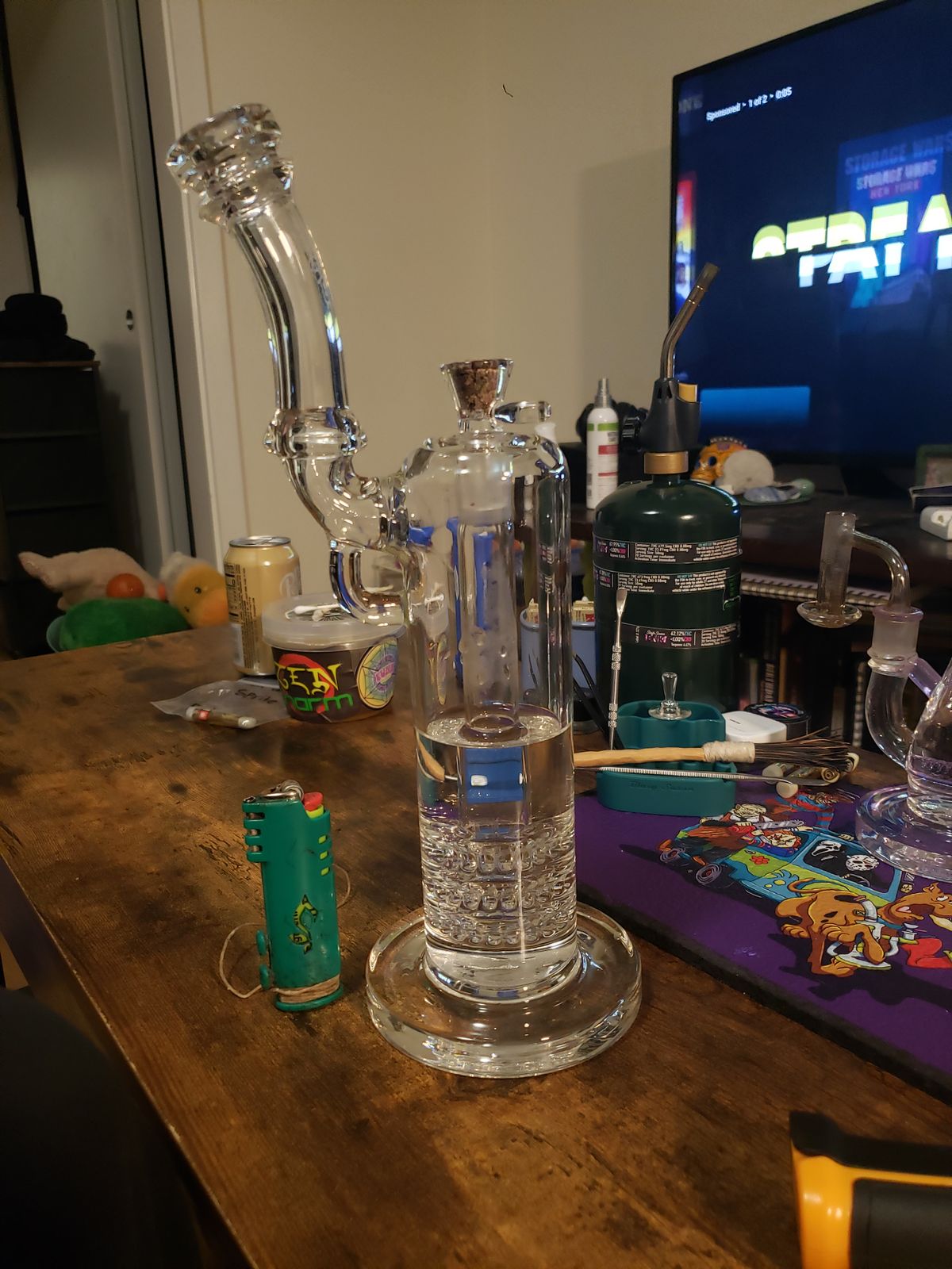 Perfect flower piece for some big smooth hits! Plenty of room for a nice white stack and the mouthpiece is at just the right angle so you're not all cranked over. Only point of critique, the downstem goes right down to an open hole style bottom and sometimes doesn't bubble up in a 360° manner. Maybe a puck diffuser at the end of the stem the shoots it up through the ratchets. Oh, and this thing bloops if you're into that lol, the way the water drains back through post-clear👍🏼👍🏼